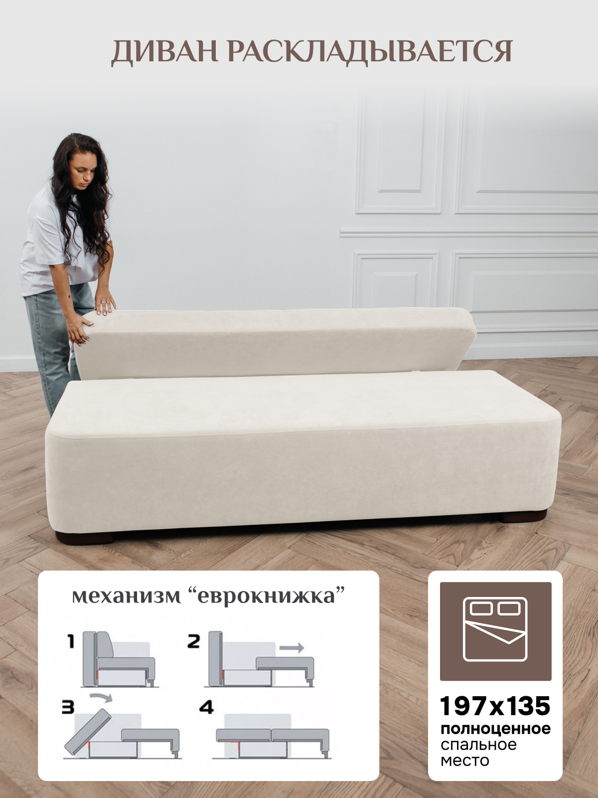 Спальное место формируется на основе механизма трансформации "Еврокнижка". Преимущества трансформации диванов Еврокнижка: Прочность. Механизм редко ломается и устроен максимально просто: сиденье нужно потянуть вперед, а на его место поставить спинку.