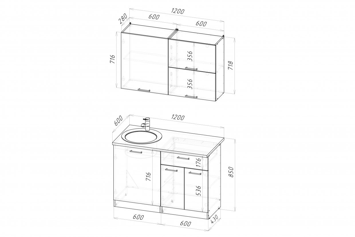 Ширина: 1200 мм; Глубина: 600 мм (со столешницей)