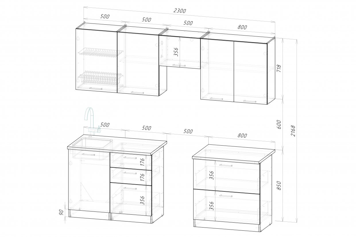 Ширина: 2300 мм; Глубина: 600 мм (со столешницей)