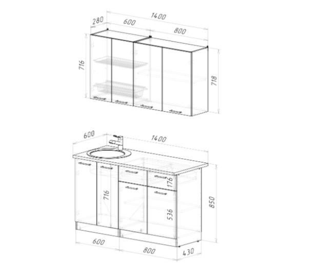 Ширина: 1400 мм; Глубина: 600 мм (со столешницей)