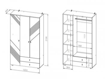 В левой части шкафа расположен отсек с четырьмя полками (одна стационарная и три съемных), в правой части шкафа расположен отсек со штангой (присадка под штангу отсутствует, покупатель устанавливает ее самостоятельно), под которым установлены два выкатных ящика.