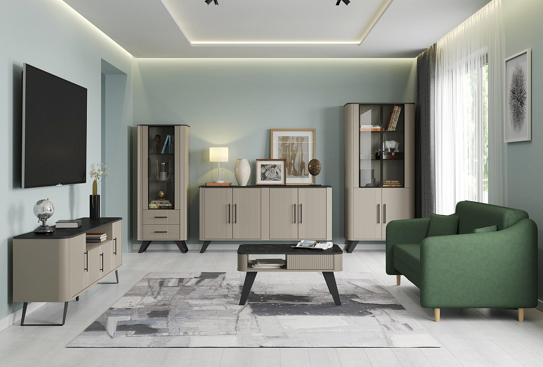 Модульная гостиная Фиделия исполняется в классическом стиле и спокойных цветах. Модель сочетает в себе простоту и функциональность, но при этом не выглядит громоздко. Она гармонично впишется в пространство, не утяжеляя его.