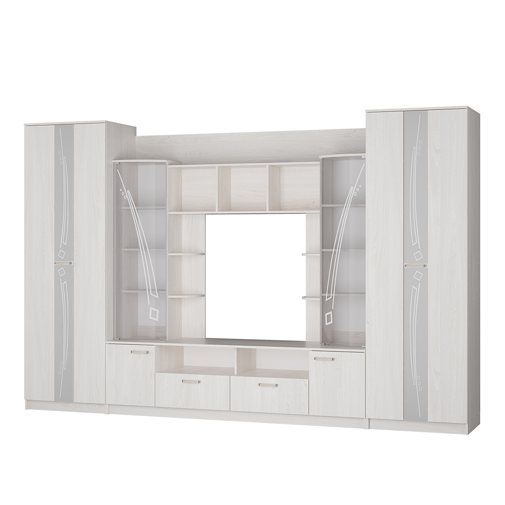 Гостиная «Венеция» – идеальный вариант для размещения большого количества вещей, включая одежду, ведь данная модель имеет зоны для ее хранения. Открытые полки вокруг ниши для телевизора позволят не только хранить предметы повседневного обихода, но и украсить интерьер. Стильные стеклостворки придают особую элегантность композиции изделия.